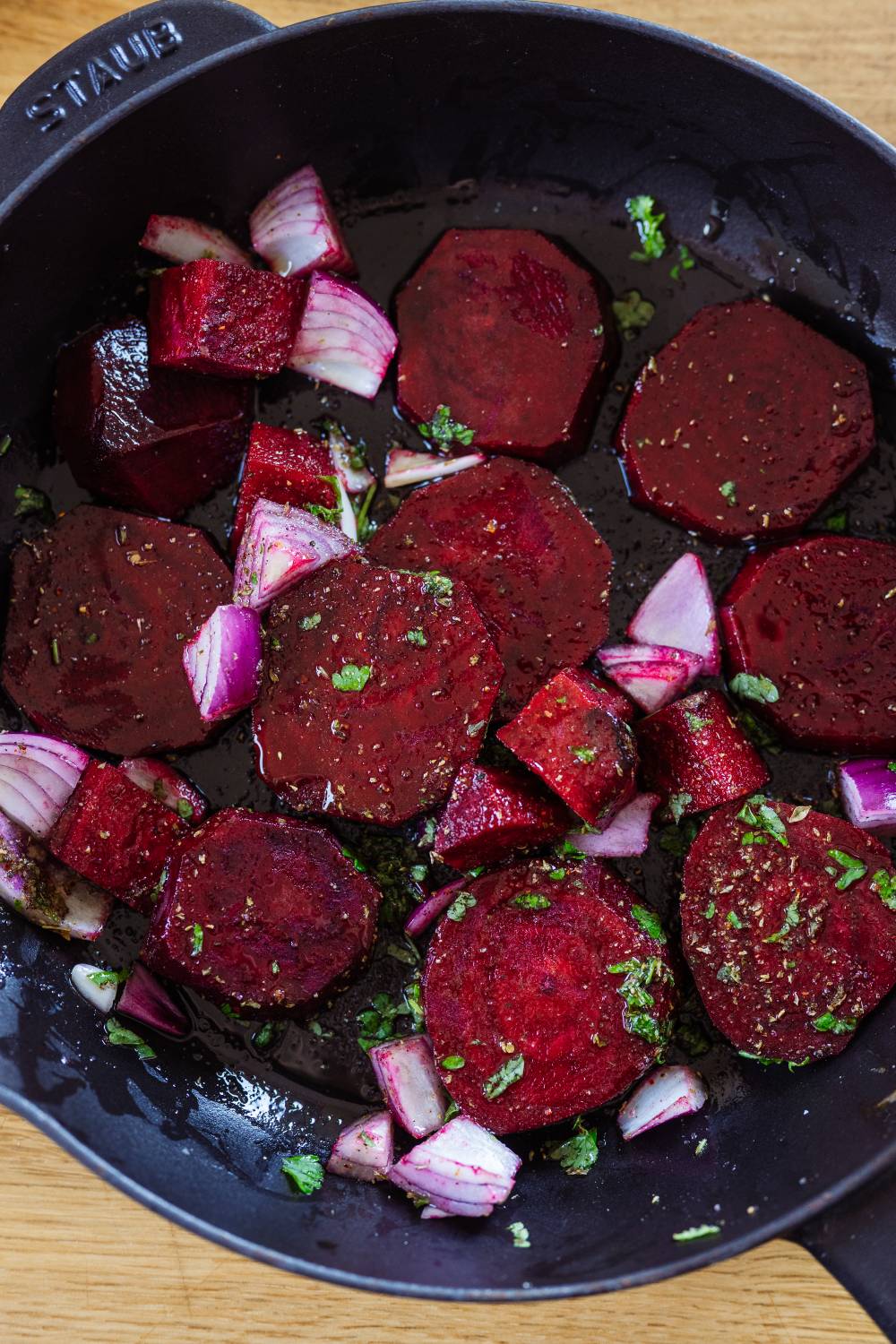 - Rote Beete schälen und in Scheiben schneiden. Rote Zwiebel in grobe Stücke schneiden.