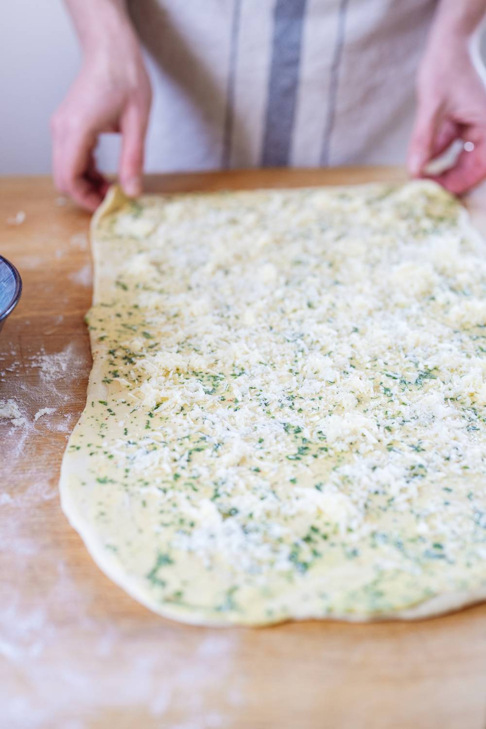 - Den Teig auf einer leicht bemehlten Fläche rechteckig ausrollen (ca. 40 × 30 cm).