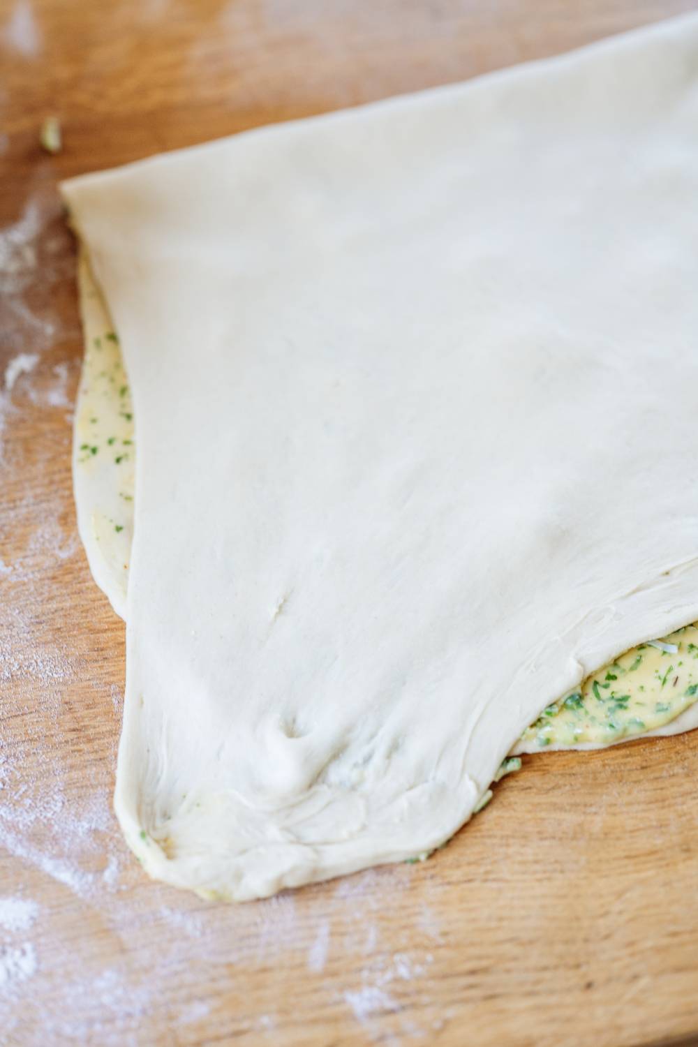 - Teig längs einmal zusammenklappen, sodass die Füllung innen liegt.