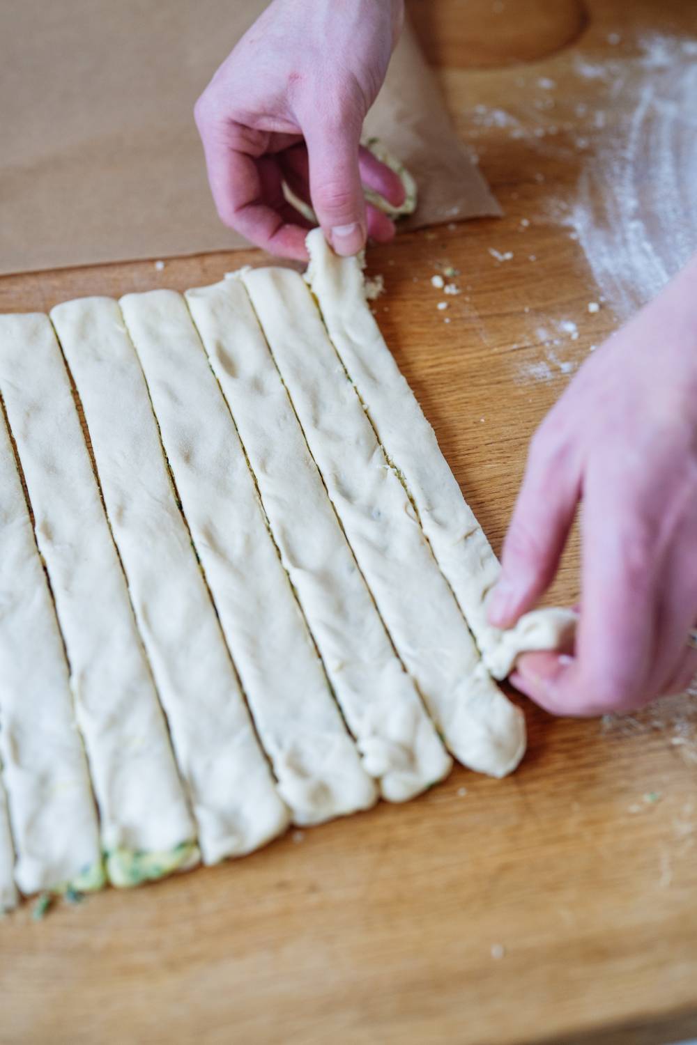 - Den Teigstreifen in 2–3 cm breite Streifen schneiden.