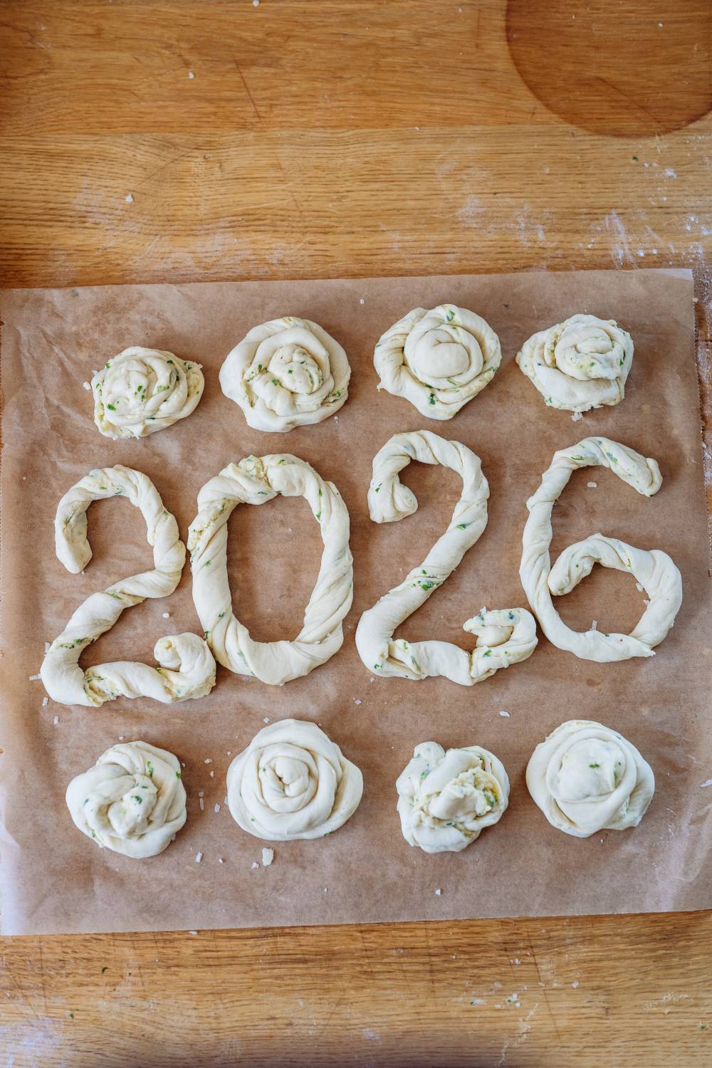 - Jeden Streifen leicht eindrehen (Spirale) und dann entweder als Knoten formen oder zu Zahlen/„2026“-Formen legen.