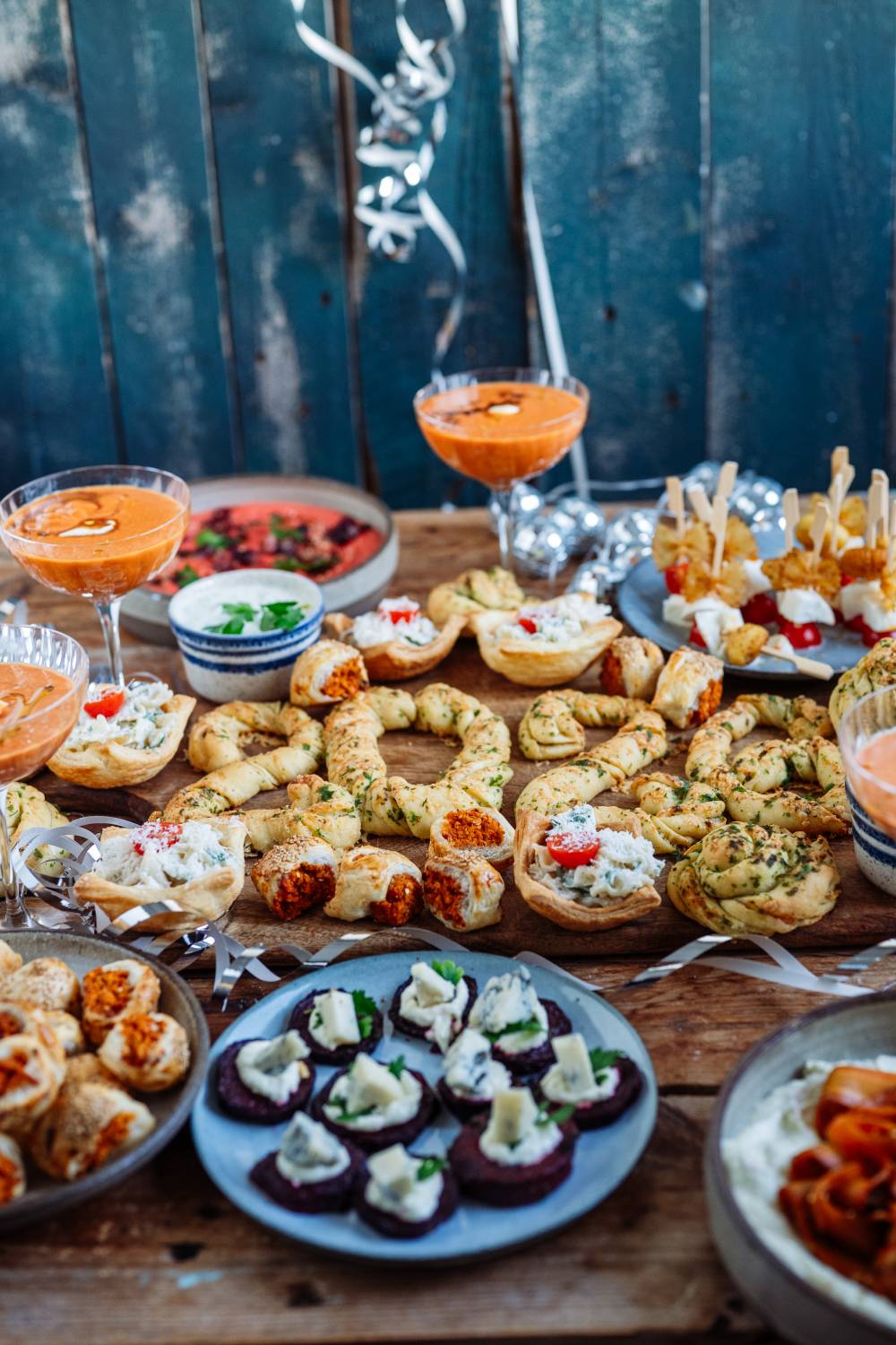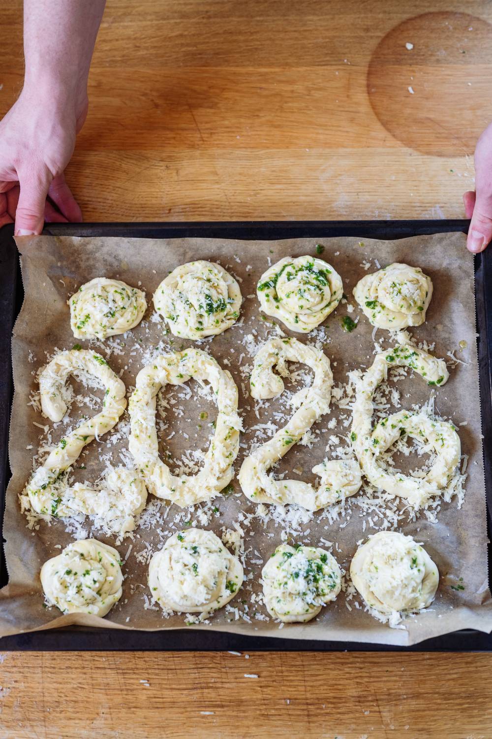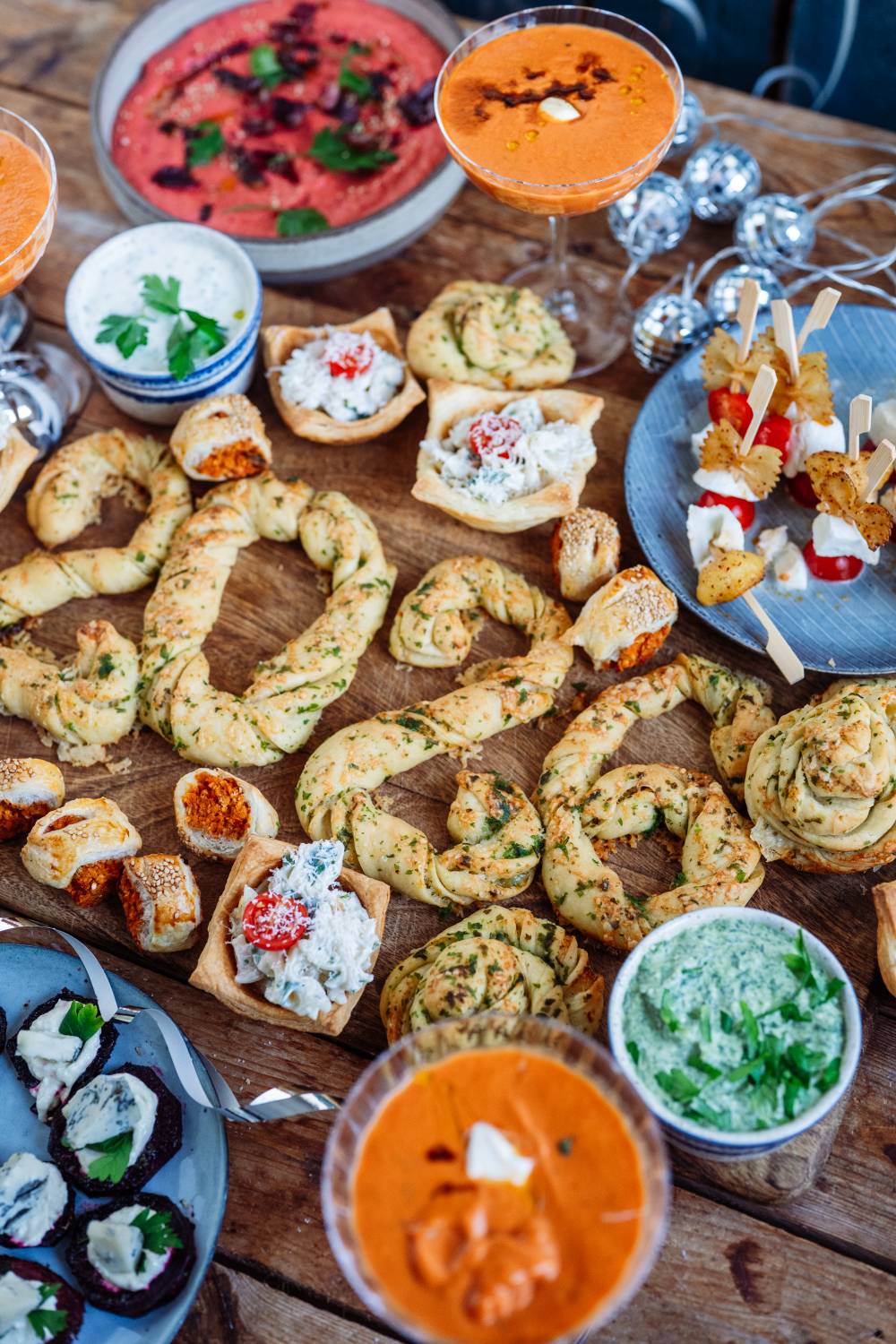 Zu guter Letzt kommt das Brot. Den Hefeteig könnt Ihr natürlich schon ein paar Stunden vorher zubereiten. Das Brot würde ich aber frisch backen oder auch hier wieder aufbacken. Wer Kräuterbrot mit Käse mag, wird dieses Brot lieben. Ihr macht aus dem Brot kleine Kräuterbutter-Käse-Stränge, diese werden in sich so gedreht, dass sie verzwirbelt sind. Und jetzt könnt Ihr euch entscheiden: Macht daraus Zahlen, Knoten oder lasst sie als lange Stangen. Ganz einfach gemacht aber ein toller Hingucker auf dem Buffet und perfekt zum Dippen. 🙂