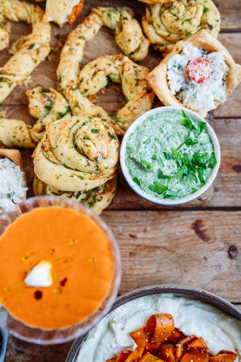 Die weiteren Dips: Spinat-Gorgonzola, Whipped Feta und Kräuterbutter-Joghurt-Dip