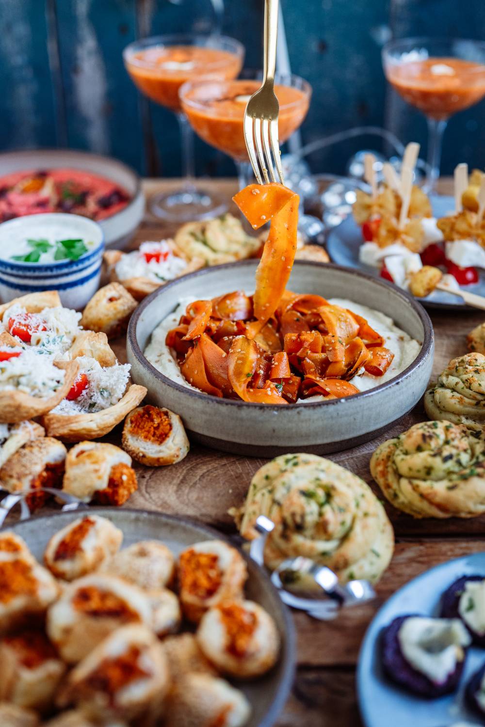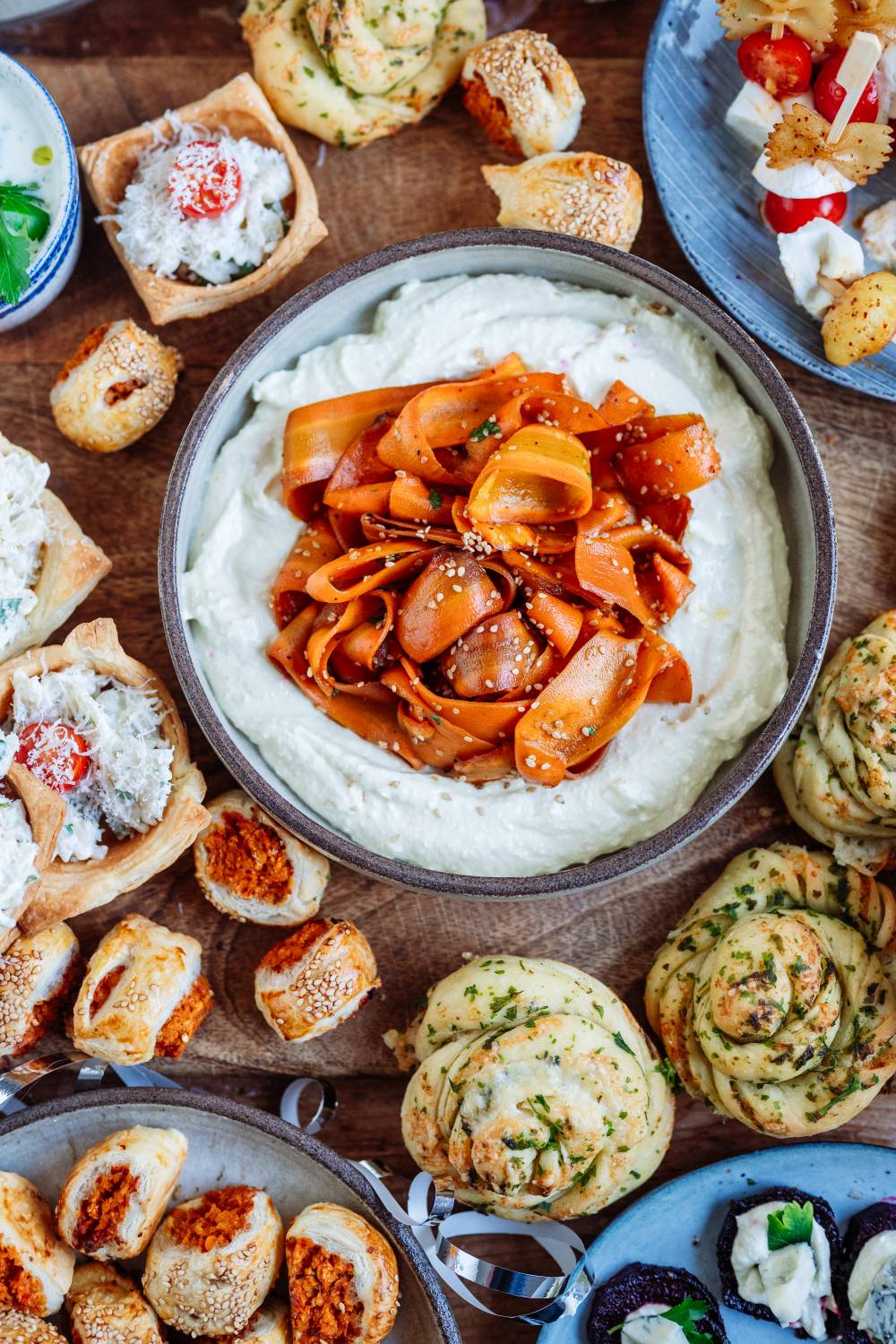 Auch der Möhren-Sesam-Salat, den man auch gerne als veganen Lachs bezeichnet, könnt Ihr schon am Vortag vorbereiten. Dafür müsst Ihr die Möhren schälen und mit einem Gemüseschäler der Länge nach in feine Streifen schneiden. Die werden mariniert und im Ofen gebacken. Danach werden sie einfach bis zum Servieren kalt gestellt. Ich habe sie auf dem Whipped Feta angerichtet und beides zusammen hat so gut geschmeckt.