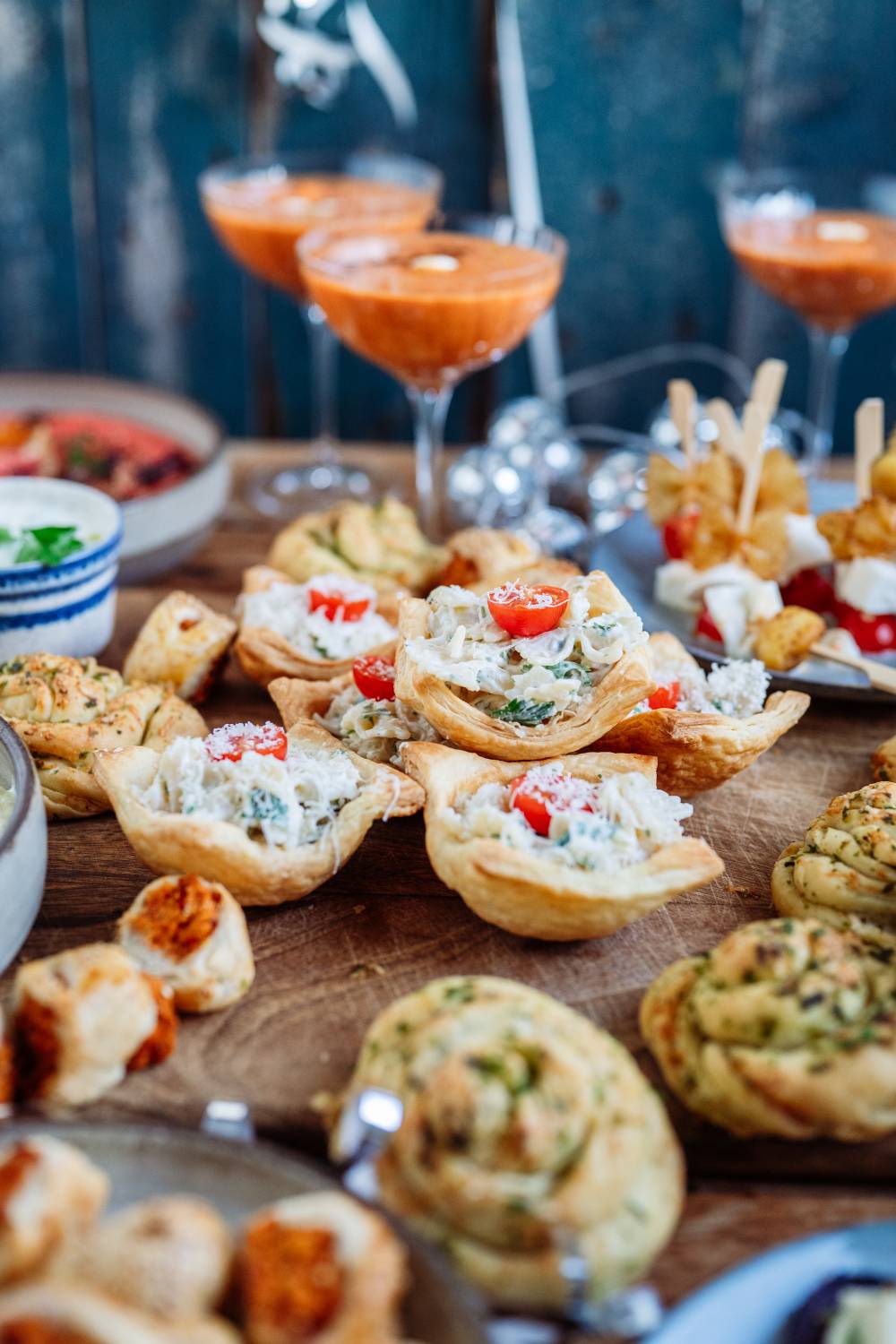 Rezept für Silvester-Snacks: Kräuter-Käse-Brot, verschiedene Dips und Fingerfood