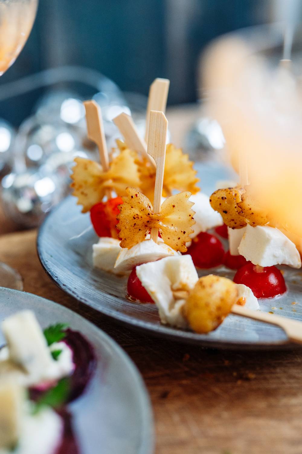 - Farfalle oder Gnocchi abwechselnd mit halbierten Tomaten und Mozzarella aufspießen.
