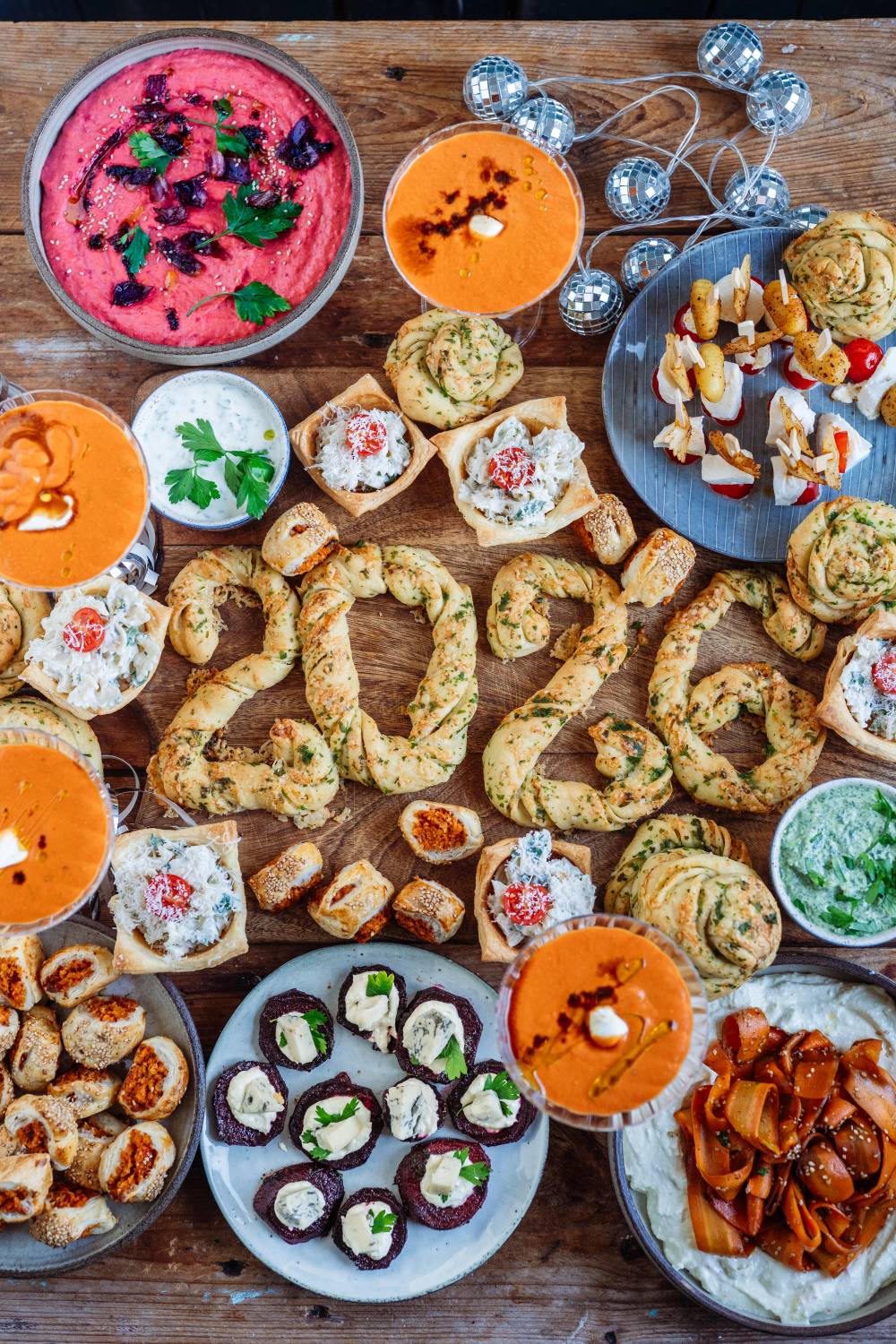 zum Jahresende habe ich noch einen besonderen Beitrag mit vielen Rezeptideen für das Silvester-Buffet für euch. Ich habe mir überlegt, wir machen ein Silvester-Brot aus Käse-Kräuter-Knoten, verschiedene würzige Dips und ein wenig Fingerfood darf natürlich auch nicht fehlen. Alle Snacks habe ich vegetarisch zubereitet. Und diese Rezepte erwarten euch: