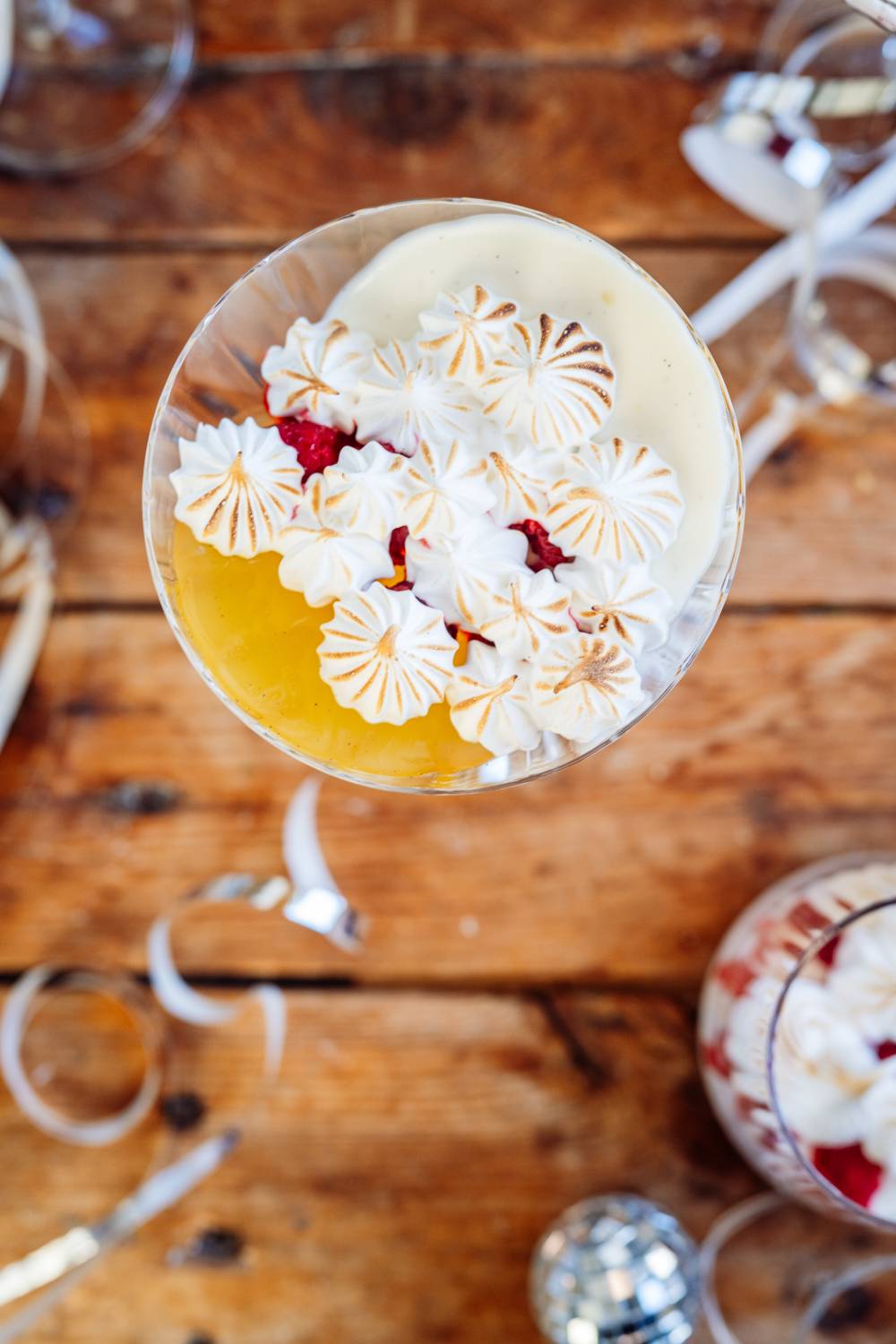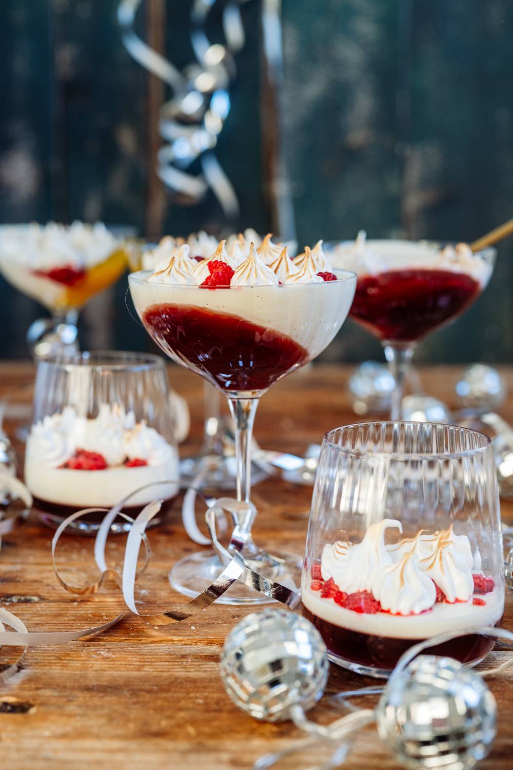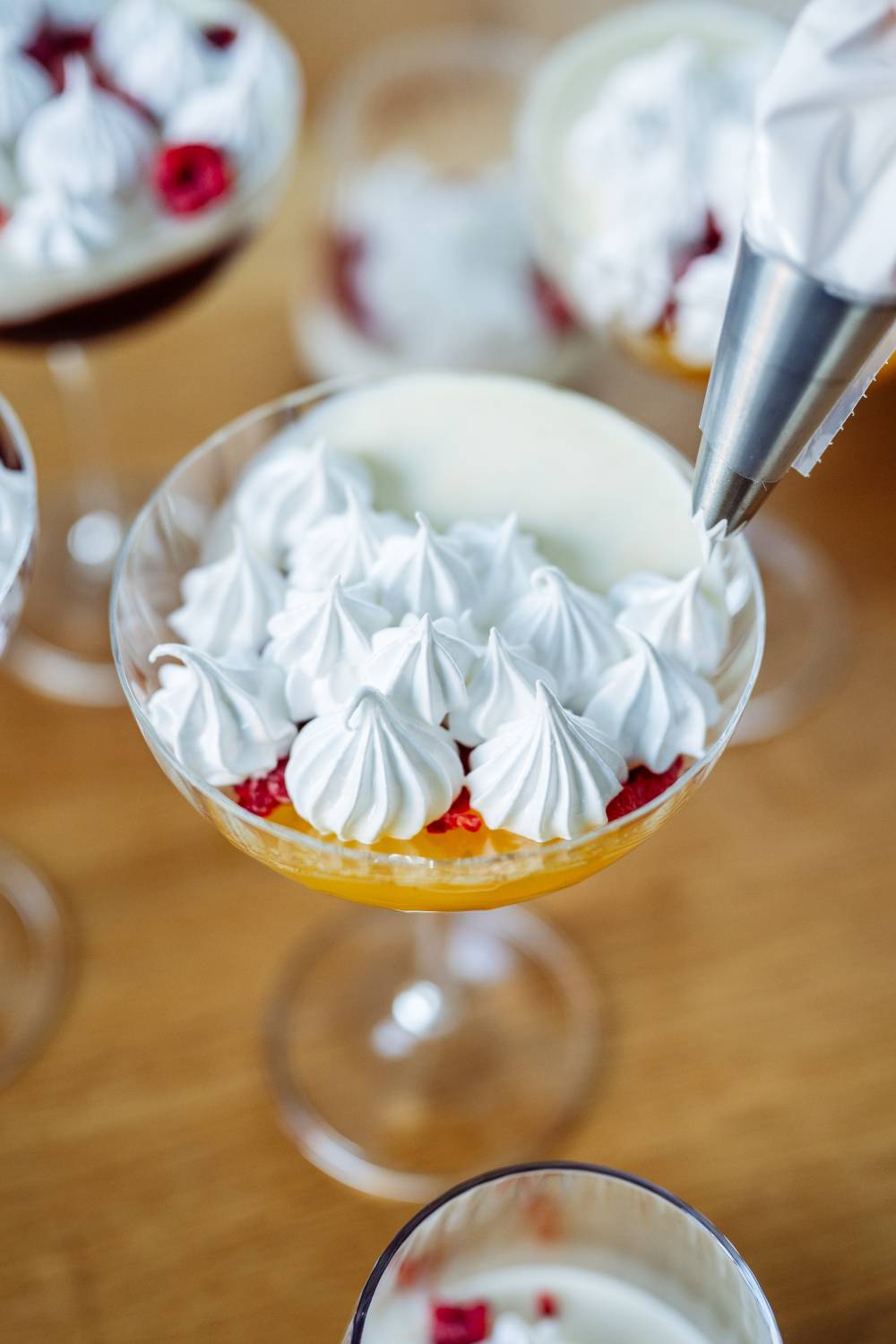 - Himbeeren etwas zerbröseln und vor dem Servieren in die Gläser geben. Baiser aufspritzen & abflämmen.