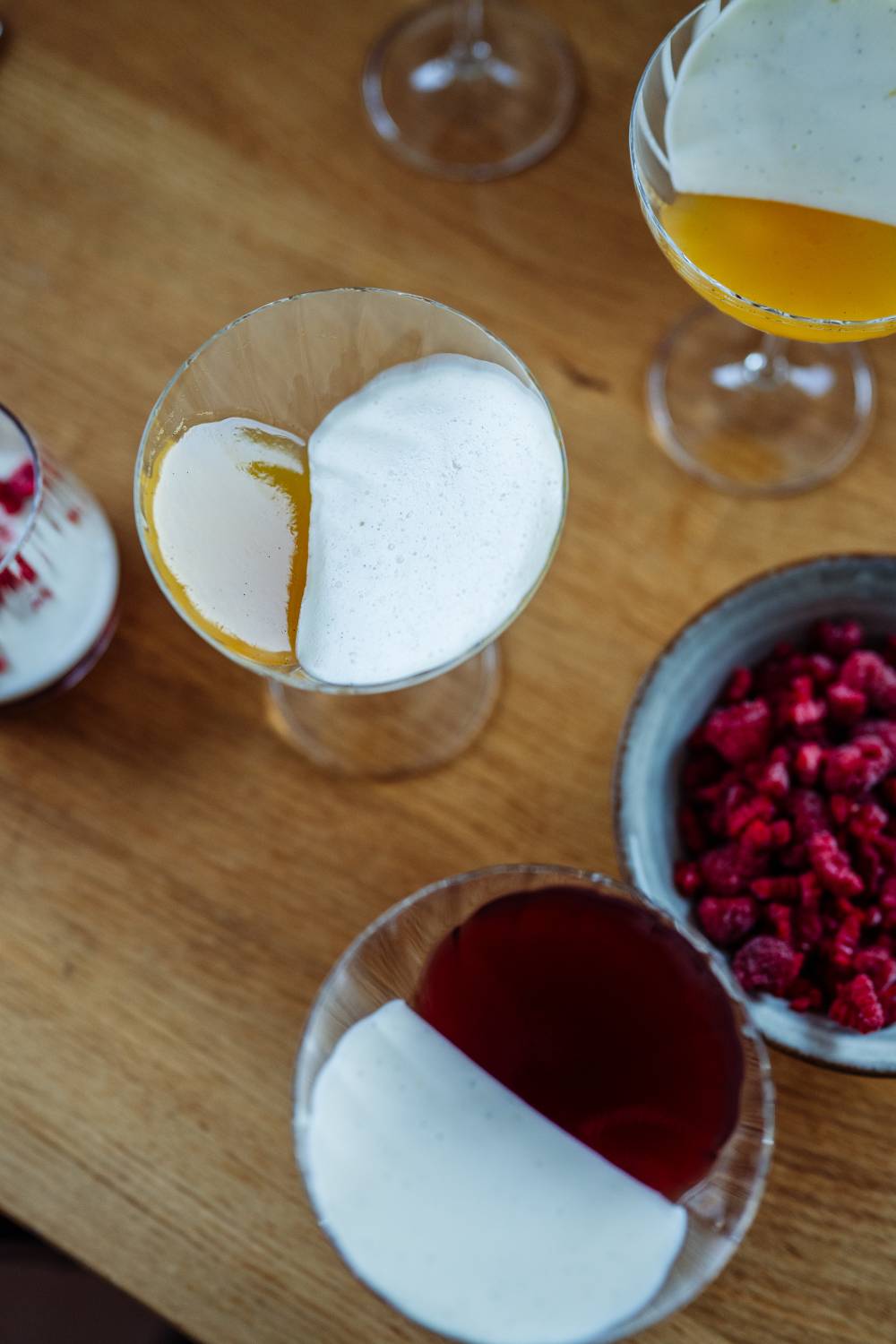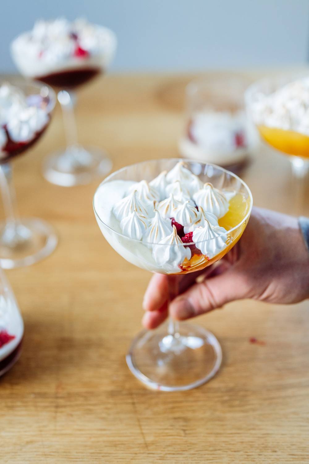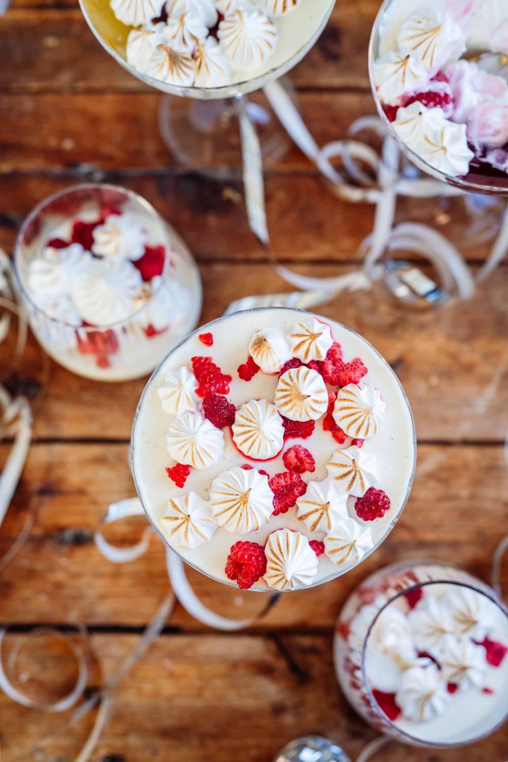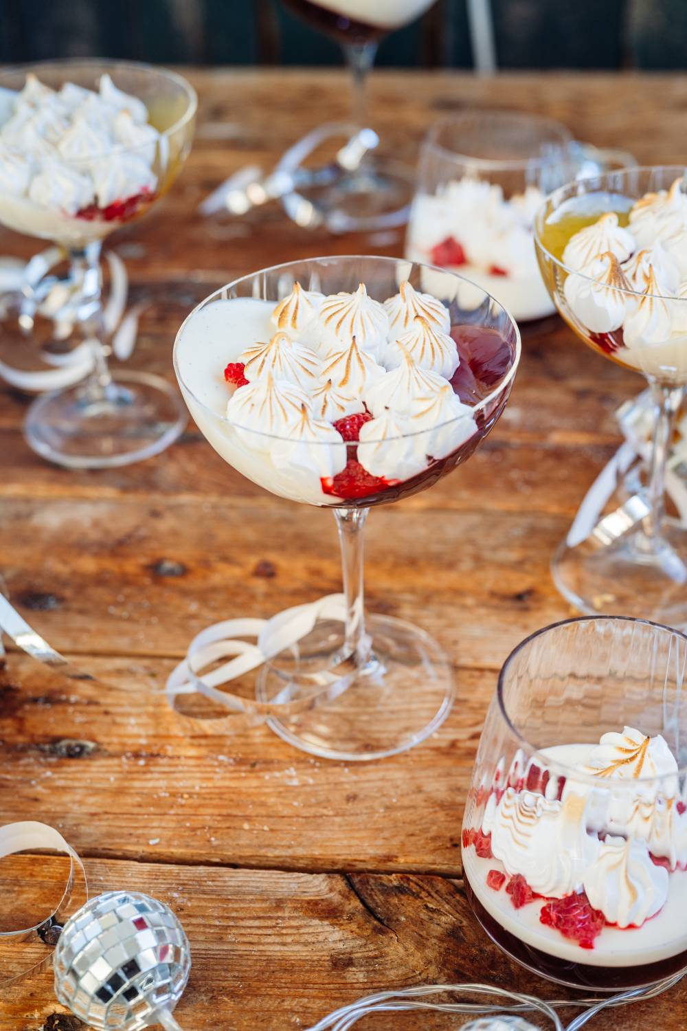 - Himbeeren etwas zerbröseln und vor dem Servieren in die Gläser geben. Baiser aufspritzen & abflämmen.