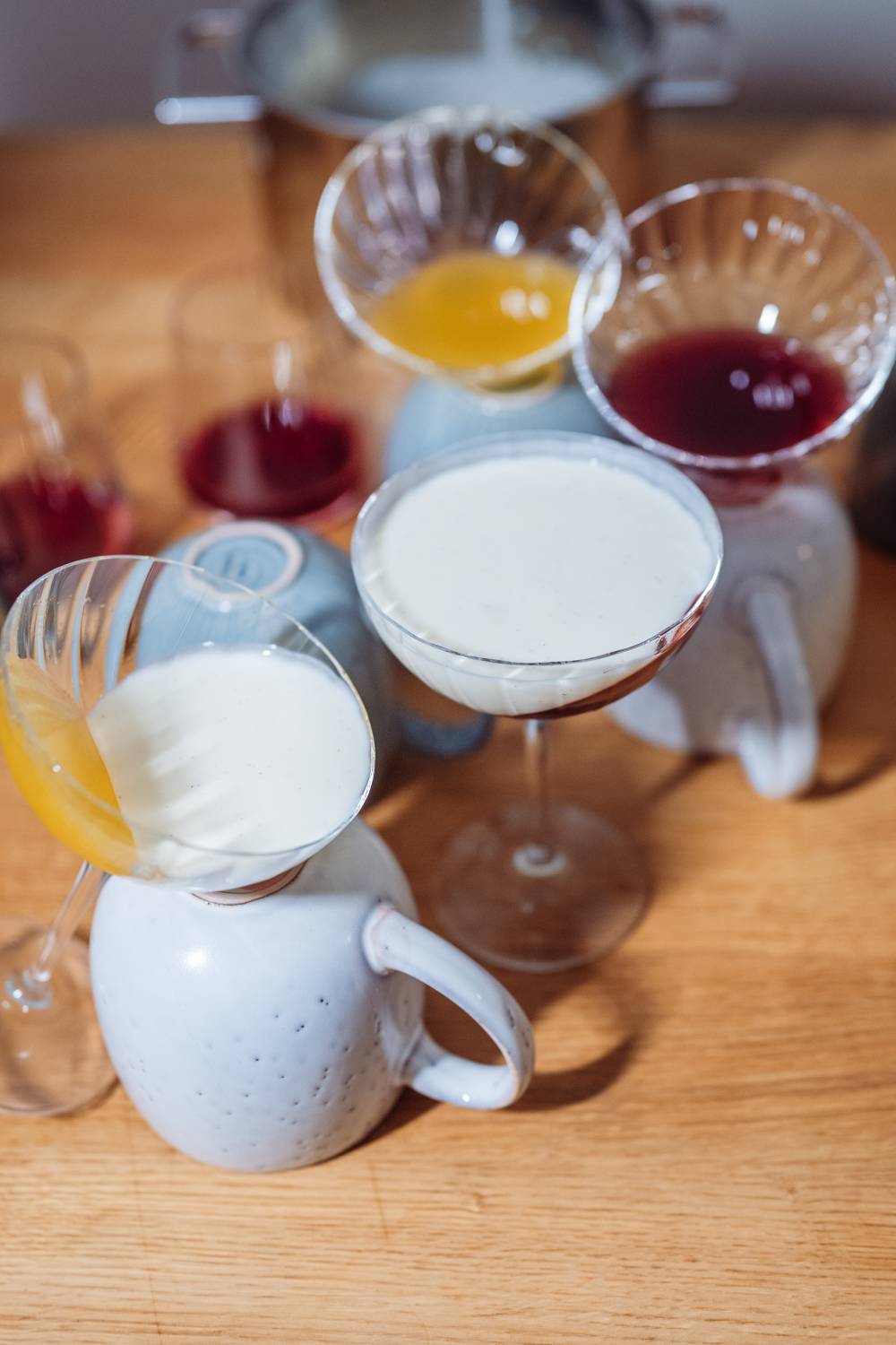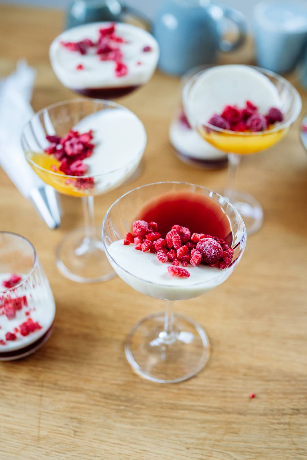 - Gläser leicht gekippt (auf zum Beispiel eine Tasse) in den Kühlschrank stellen. Masse bis zum gekippten Rand in Gläser füllen, 1–1,5 Std. kühlen.