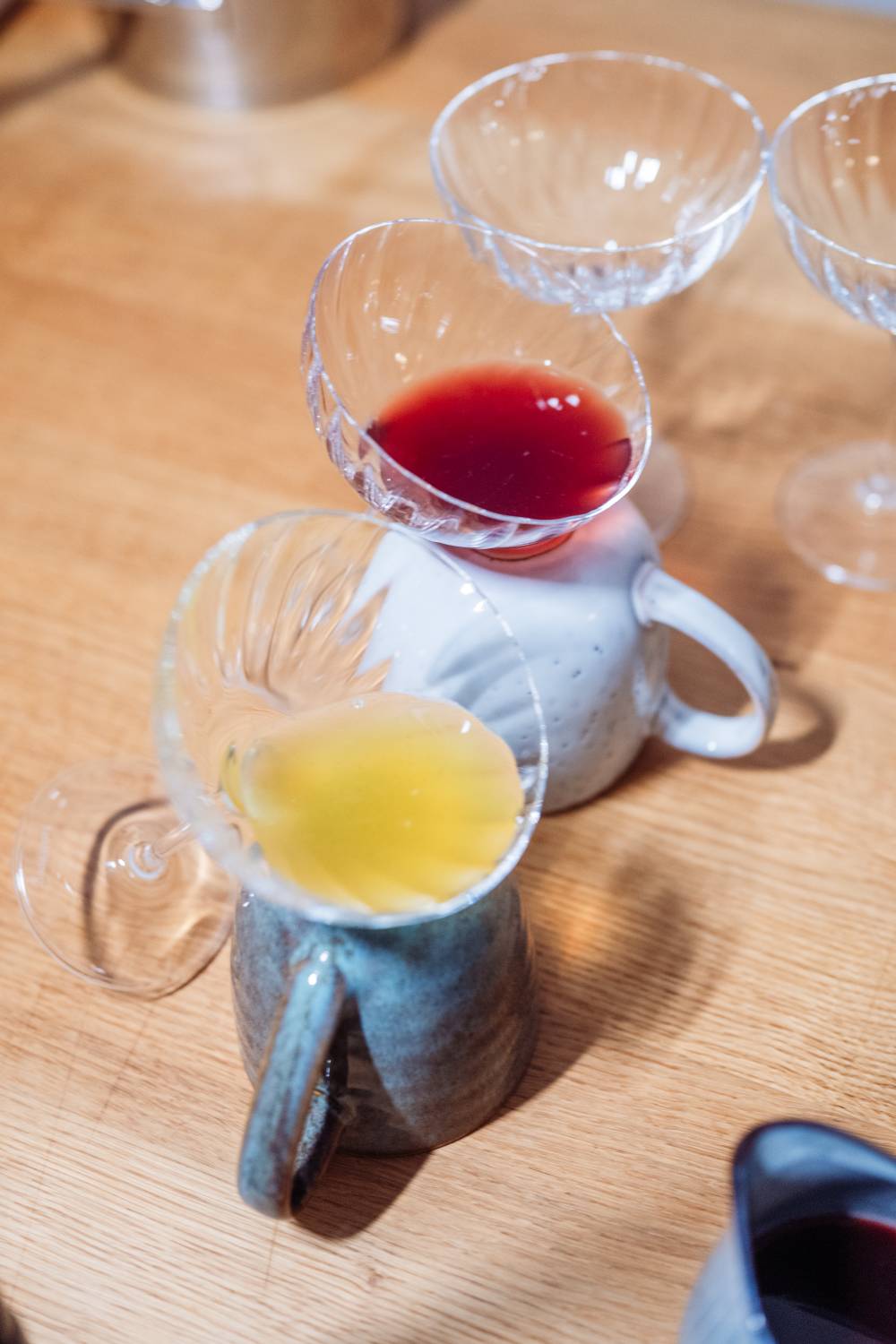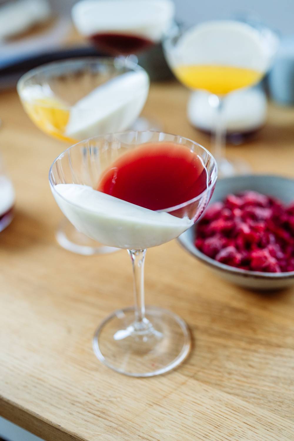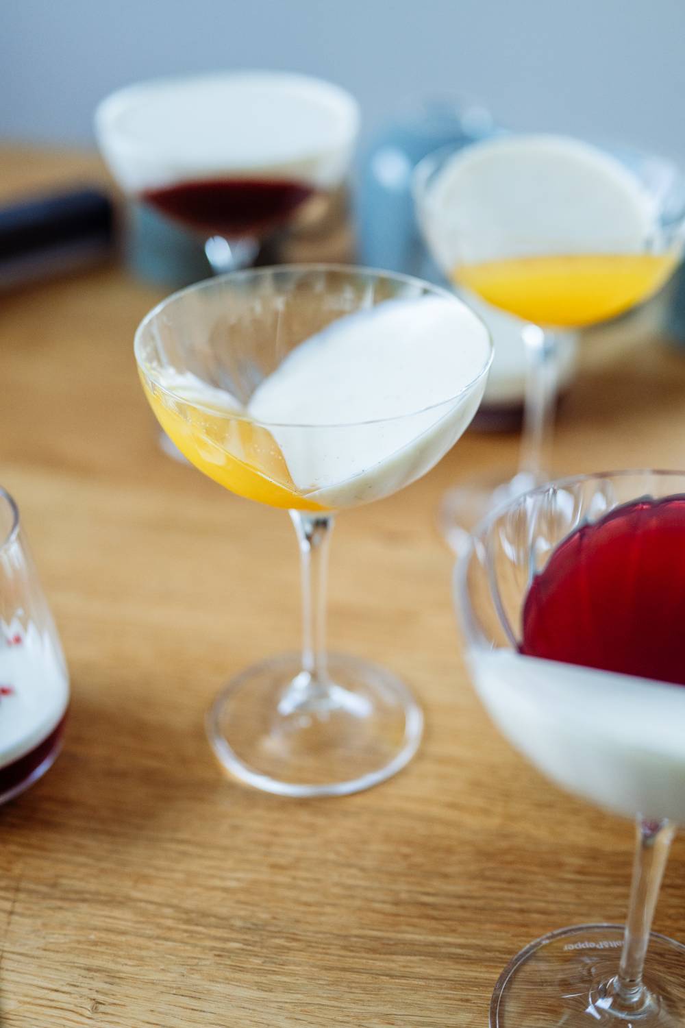 Kommen wir zu unseren beiden Hauptkomponenten. Das Dessert besteht aus einer Saft- oder Sektschicht und eine Sahne-Quark-Zitronenschicht. Beides könnt Ihr natürlich nach einander so ins Glas schichten oder Ihr macht es wie ich und winkelt das Glas zum Befüllen leicht an. So muss es dann zum Gelieren auch im Kühlschrank stehen. Ich habe mir dafür einfach ein paar passende Gläser ausgesucht und es vorab an Tassen ausprobiert, ob die Gläser so in Schräglage bleiben. Das hat ganz einfach geklappt. Nun braucht Ihr noch ein wenig Platz im Kühlschrank und es kann losgehen.
