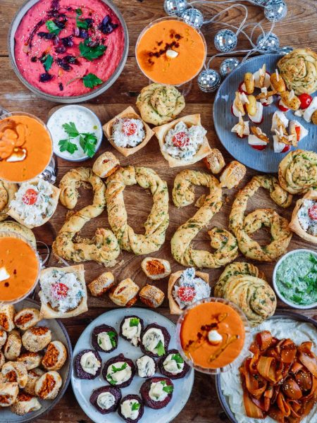 Silvester-Snacks: Kräuter-Käse-Brot, verschiedene Dips und Fingerfood